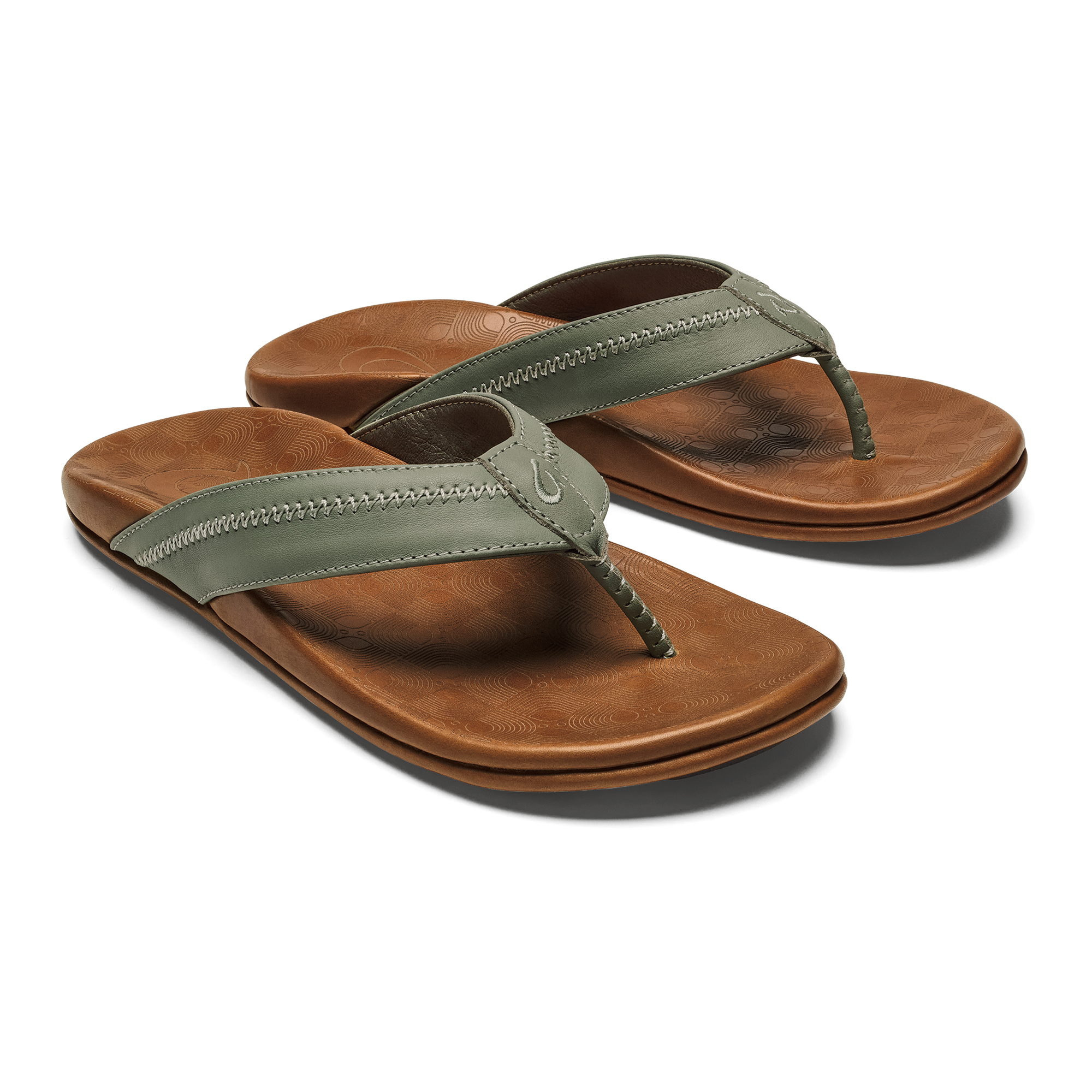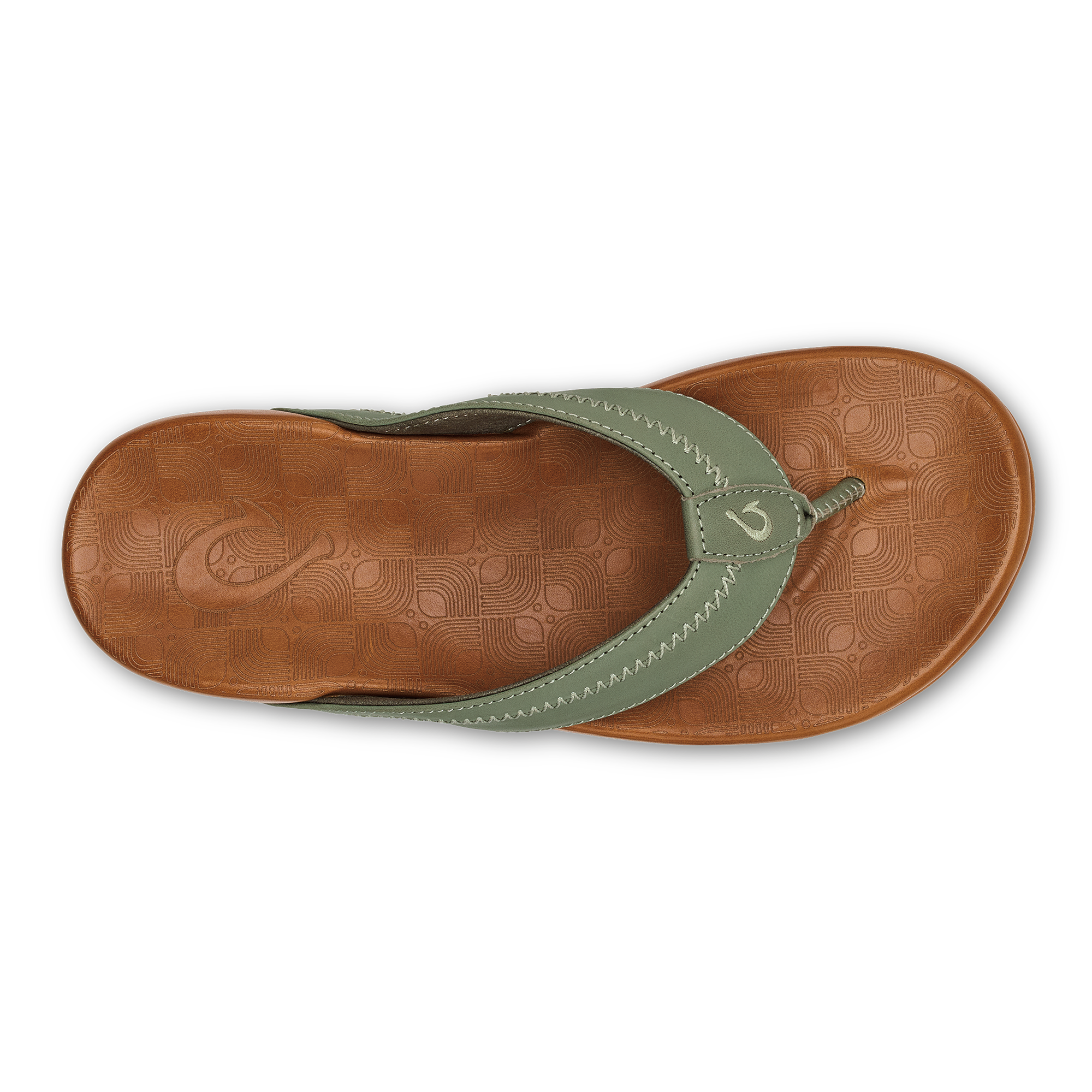 OluKai Craftsmanship: Features handsewn traditional whipstitching and moko tattoo artwork on the footbed, showcasing unique cultural artistry.